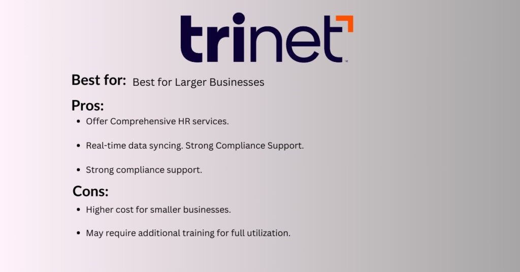 TriNet is one of the top HR services for bigger businesses because of its range of fully integrated human resources solutions covering payroll processing, benefit administration, and compliance support.