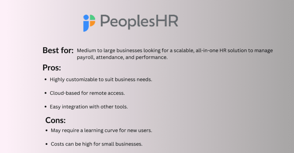 1. PeoplesHR: Medium to large businesses looking for a scalable, all-in-one HR solution to manage payroll, attendance, and performance.